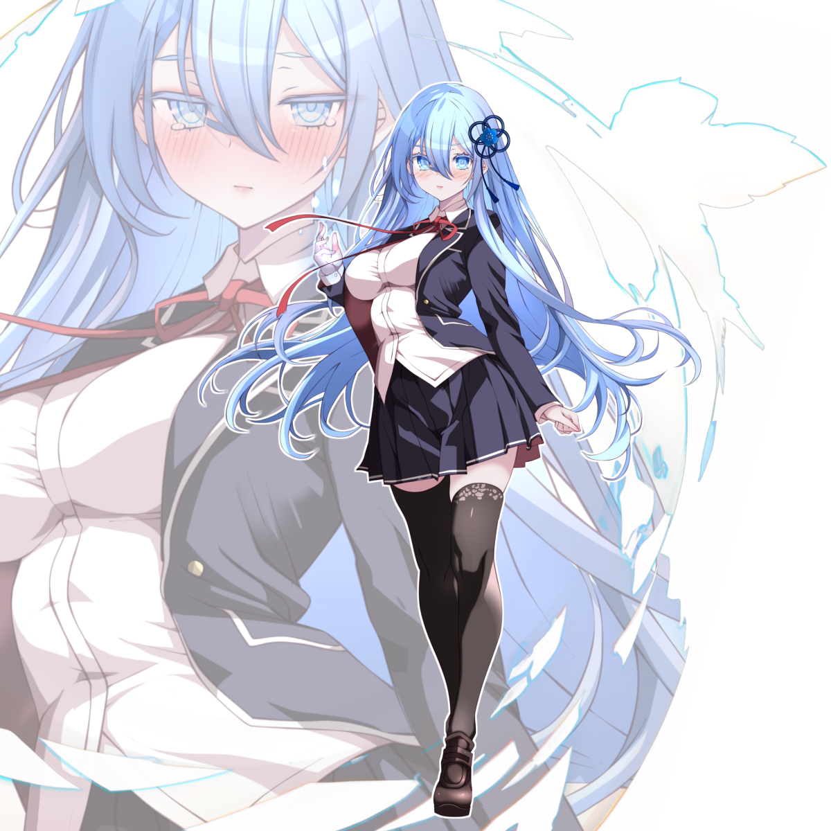 腰あたりまで長く伸ばされた蒼い髪。 覗き込めば澄んだ空を想起させる蒼い瞳。 平均より少し低めの背丈に華奢な体つきがほんのり儚げな雰囲気を与える。 制服の着こなしはしっかりと清楚に。自然に選ぶリボンや髪留めは無意識に蒼いものを選びがち。